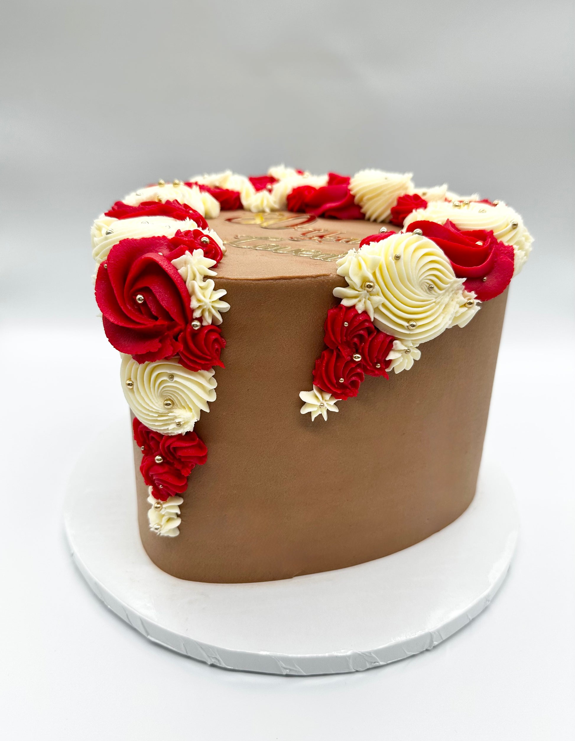 Our Forever Loved Heart Cake is a romantic and luxurious design featuring a smooth buttercream finish and elegant piped florals in contrasting colours. Accented with delicate gold pearls and artfully arranged swirls, this heart-shaped beauty makes the perfect statement for birthdays, anniversaries, or any heartfelt celebration.